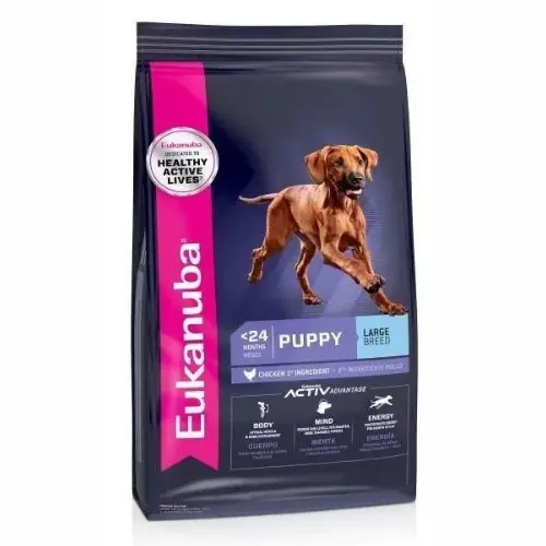 Eukanuba Puppy Large Breed es un alimento balanceado completo para cachorros entre 1 y 12 meses de edad en el caso de razas grandes, o hasta los 24 meses en el caso de razas gigantes, o perros mestizos que en su etapa adulta pesan más de 25 kg.
