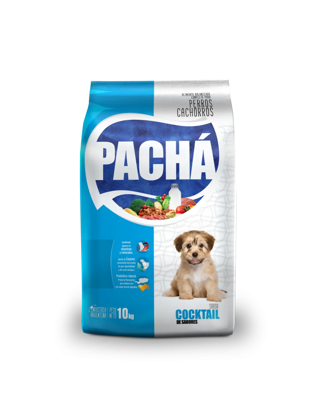 Pachá Cocktail de Sabores es la nueva linea de alimentos elaborada con carnes, cereales y vegetales que combina un balance nutricional óptimo con los sabores preferidos de tu cahorro. Pachá garantiza la calidad y frescura de sus productos pues los elabora con materias primas seleccionadas y procesadas bajo normas internacionales con la más alta tecnología. Ingredientes. Harina de carne y hueso, harina de pollo, harina de pollo, harina de pescado, trigo, arroz, maíz, gluten de maíz, germen de maíz, germen de maíz desgrasado,germen de trigo, centeno, harinas de soja, maní, maní desgrasado, sorgo, cebada, avena, salvado de avena, levadura de cerveza, sal, grasa de pollo, grasa vacuna, aceite vegetal, conchilla, gluten feed, fibras de maíz, sal, cloruro de potasio, pulpa de remolacha, pulpa de citrus, zeolitas, leche en polvo, huevo en polvo, fructo-oligosacráridos, extracto de yucca shidigera; saborizantes: hidrolizado de víceras de ave e hidrolizado de menudencias porcinas, Colorantes: caramelo, eritrocina, tartrazina, indigotina, amarillo-anaranjado; antioxidantes: BHT, BHA, TBHQ, acido cítrico, galato de propilo;? antifúngicos:dipropionato de armonio, ácido propiónico; núcleo vitaminico mineral: vitaminas A, D3, E, K B1, B2, B6, B12, ácido fólico, ácido nicotínico, pantotenato de calcio, biotina, colina; minerales: cobre, hierro, zinc, yodo, magnesio, selenio. Minerales: zinc, hierro, cobre, yodo, magneso y selenio.