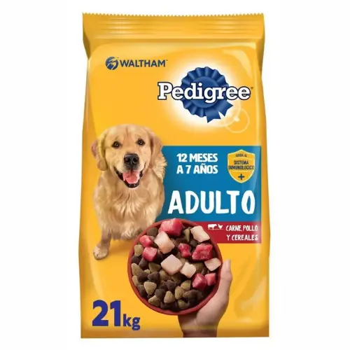 PEDIGREE® Adultos Sabor Carne Pollo y Cereal es alimento seco 100% completo y balanceado, desarrollado especialmente para perros adultos entre 1 y 7 años de edad. - Ayuda al sistema inmunológico gracias a su contenido de antioxidantes, vitamina E y Selenio. - Contribuye a una piel y pelaje saludable. - Contiene fibras y proteína de alta calidad para una óptima digestión. - Granos selectos. - Proteínas de alta calidad.